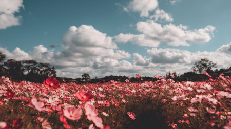 A stunning view of a vibrant field filled with blooming pink and white flowers under a bright blue sky adorned with fluffy clouds.