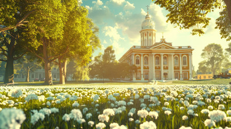 Beautiful spring landscape with blooming tulip field and church in the park.