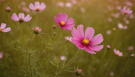 Cosmos flowers blooming in the garden at sunset. Nature background.
