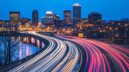 A stunning night cityscape featuring vibrant light trails along a highway, with a modern urban skyline shimmering in the background, showcasing the beauty of city life after dusk.