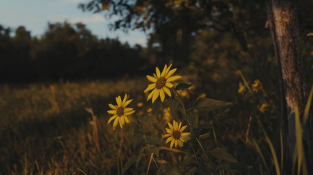 Blooming wildflowers stretch towards the vibrant sunset in a serene meadow filled with colors