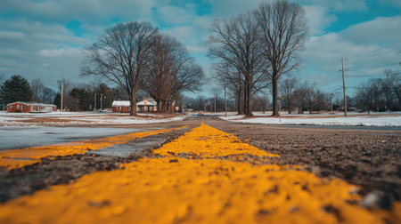 Extreme low-angle photograph captures the rough texture of asphalt pavement with a bold, bright yellow dividing line dominating the foreground, leading the viewer's eye down a quiet road in a semi-rural setting during winter. Bare deciduous trees frame the view under a dramatic, slightly overcast blue sky, with glimpses of small, modest buildings and patches of snow visible on the grassy surroundings.