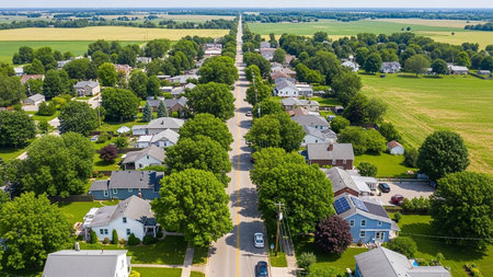An elevated aerial perspective of a tree-lined suburban street featuring numerous houses with well-kept lawns and gardens. The scene captures a typical residential neighborhood bathed in daylight,...