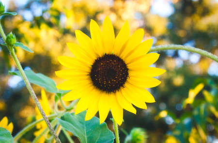 Sunflower on nature background. Sunflower blooming on the field on a bright sunny day . Close-up of sunflower. Sunflower natural background. Sunflower are blooming out. Blossom, not yet open, sunflower. flowers in the nursery. Green Sunflower on natural background. Sunflower blooming in garden