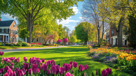 This tranquil scene captures a spring morning in a picturesque town with blooming flowers, green trees, and colorful homes lining the peaceful street.