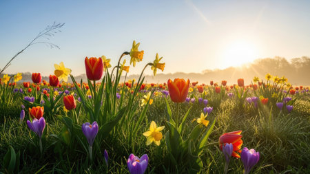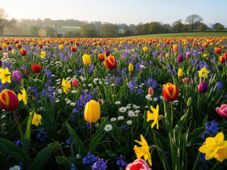 A vibrant spring meadow bursts with colorful tulips, daffodils, and hyacinths in full bloom under warm sunlight, creating a cheerful natural scene.