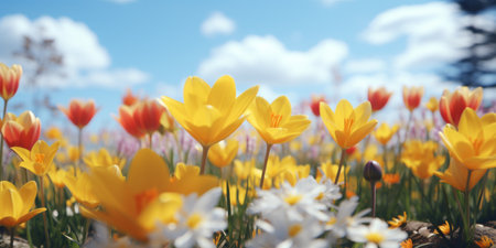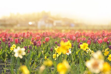 A diverse array of blooming flowers fills the frame, with vibrant yellow daffodils, purple tulips, and white blossoms prominent. The image displays a natural outdoor setting, bathed in warm sunlight. It can be utilized for various commercial purposes, including stock photography and editorial content.