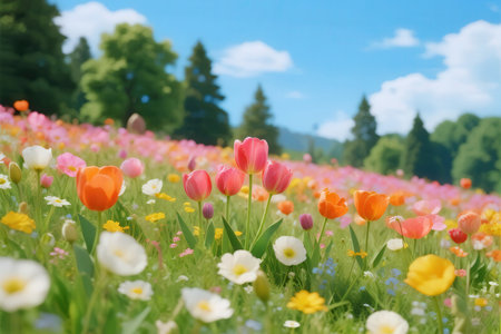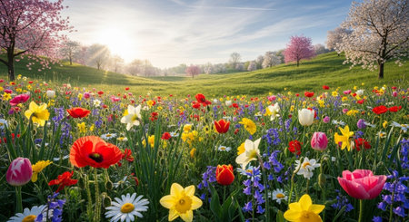 Vibrant spring meadow with colorful wildflowers and blossoming trees