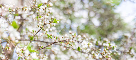 Banner. macro photography. Spring, nature photo wallpaper. Cherry blossoms are blooming in the garden. Blooming white buds on the branches of a tree.