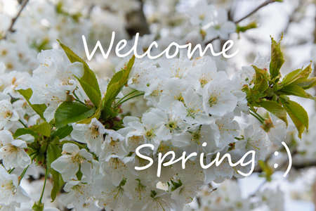 Delicate white cherries blossom flowers background with text Welcome Spring