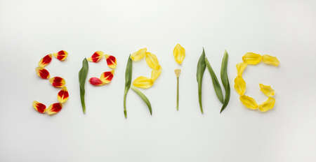 Word SPRING with fresh colorful tulips on vibrant yellow background. Minimal spring bloom concept. Flat lay, top view