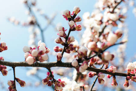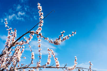 Blooming flowers apricot branch in spring garden against blue sky