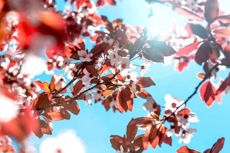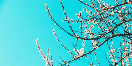 Blooming tree branch close up next to clear blue sky in a sunny spring day. Nature background for blogs, seasonal cards and web design. Selective focus