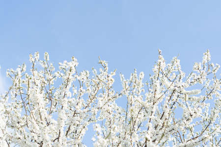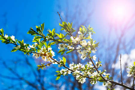 a cherry plum branch blooming with white flowers in the garden in spring against the background of the sunny sky. High quality photo