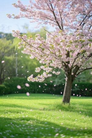 Beautiful pink petals flying in air in blooming cherry blossom woods in Spring. Spring seasonal concept. AI generated.