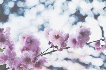 Branches of cherry blossoms. Light vintage cross-processing and panoramic frame. Springtime concept