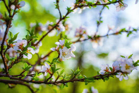 background with spring apple blossom. Blossoming branch in springtime Blooming apple tree in spring time.fresh Apple tree twig with flowers and leaves on garden