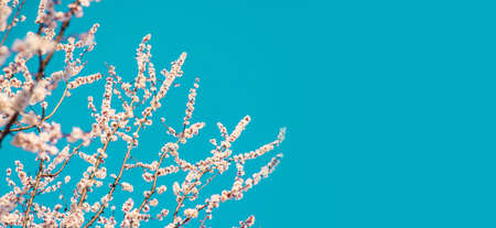 Sakura flower, spring blossom and April floral nature on blue background. Banner for 8 march, Happy Easter with place for text. Springtime concept for greeting cards with copy space