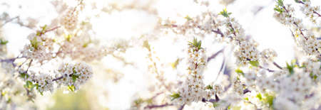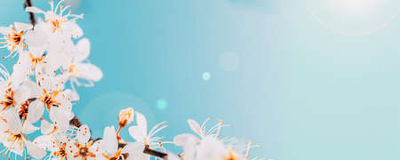 Spring banner or background art with white blossom. Beautiful nature scene with blooming tree and sun flare. Spring flowers. Springtime.