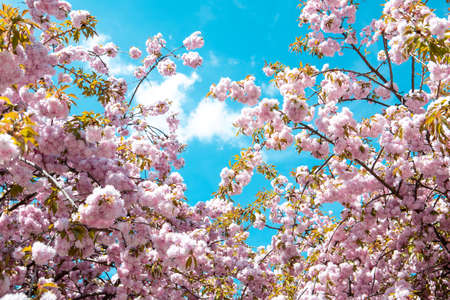 Amazing pink cherry blossoms on the Sakura tree. blue sky.