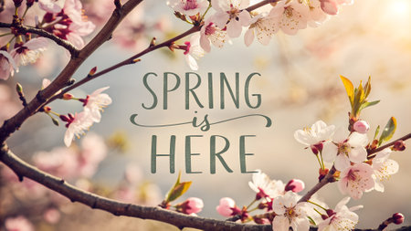 Bright and cheerful photograph, text Spring is here over a background of blooming flowers, arrival of a fresh and colorful season. For seasonal promotions, greeting cards, social media.