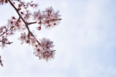 Blooming plum branches against the sky. Spring background.