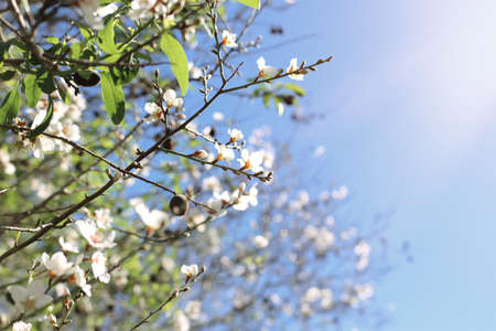 Beautiful white cherry blossom branches against sunny blue sky