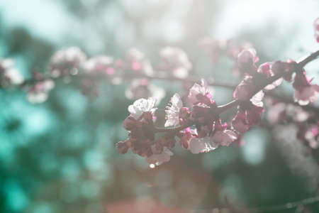 Vintage background of apple tree flowers bloom, floral blossom in sunny spring