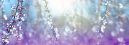 Spring banner or background art with white blossom. Beautiful nature scene with blooming tree and sun flare. Spring flowers. Springtime.