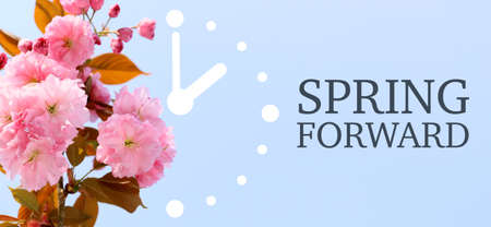 Beautiful blossoming tree branch and drawing of clock on blue background. spring forward