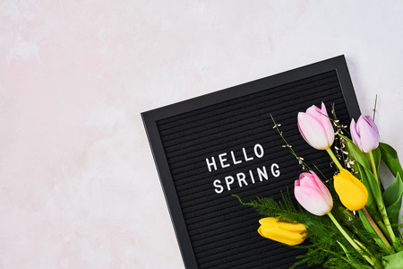 Spring concept. Pink and yellow tulips on letterboard with quote Hello Spring over pink background. Top view with copy space for text. Flat lay.