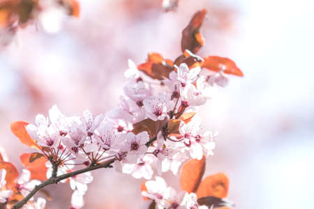 Spring background art with pink plum tree blossom. Beautiful nature scene with blooming tree and sun flare. Abstract blurred background. Shallow depth of field.