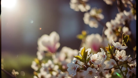 spring bloom of cherry or apple tree with white flowers at blue blurred background with lens flare