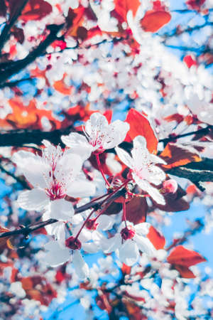Fresh white flowers blooming on tree branches in spring, filtered close up.