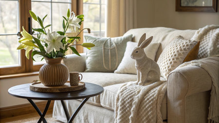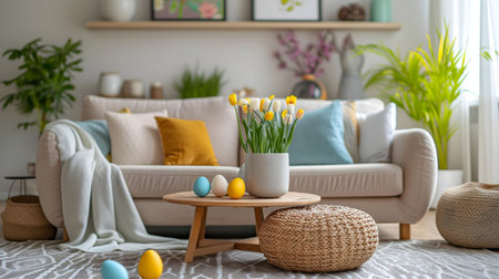 A beautifully arranged living room scene with soft furnishings, fresh tulips, and pastel Easter eggs, creating a serene and welcoming space infused with bright natural light.