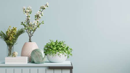 Interior wall mockup with green plant,Light blue wall and shelf.3D rendering