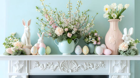Pastel Easter mantelpiece with bunnies, eggs, and spring flowers. A beautiful spring holiday decoration.