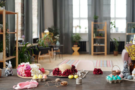 Living room interior with armchair, coffee table, vase with spring flowers and easter eggs
