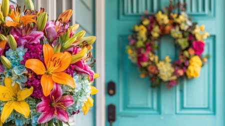 A stunning floral arrangement featuring vibrant lilies and hydrangeas stands by a turquoise door adorned with a colorful wreath, perfect for spring decor.