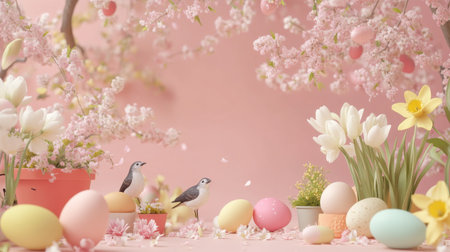 Colorful decorations feature pastel eggs nestled among blooming flowers and cherry blossoms. Two birds add life to this cheerful springtime display, enhancing the festive atmosphere.