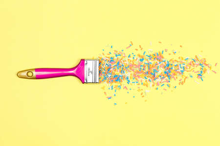 A stream of vibrant, multi-colored sprinkles falls from above, accumulating into a large pile on a bright yellow surface.