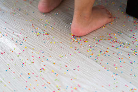 Colourful Sugar sprinkles, decoration on the wooden floor with a child foot stepping on. Messy and scattered. Childhood concept.