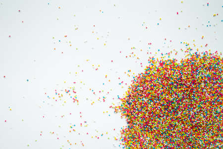 Multicolored Sugar sprinkle dots, decoration for cake, isolated on white. Birthday and holiday background. Flat lay, top view. copy space