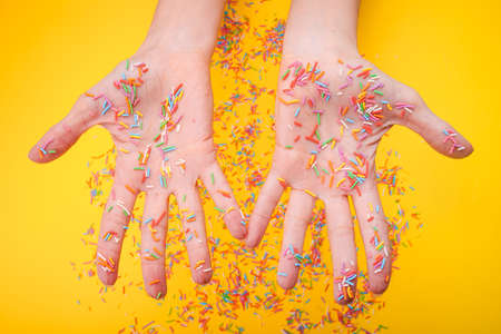 Hand holding colorful sprinkles for decorating, placed on a shiny black background. Studio shot