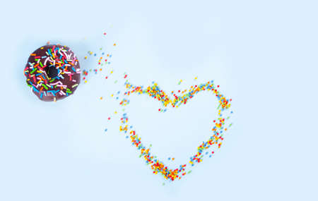 Delicious donut with chocolate icing and heart shaped candies sprinkles confetti. Valentines day concept.