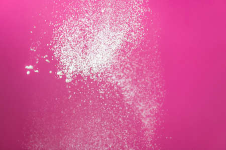 White powder splash isolated on pink background. Flour sifting on a pink background. Explosive powder white