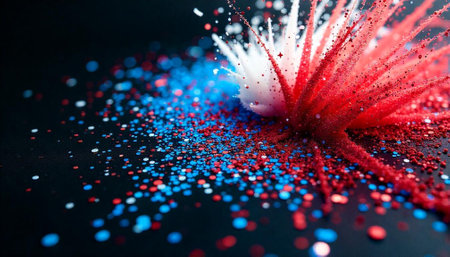 Abstract red white and blue glitter explosion on black background