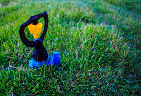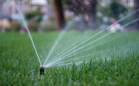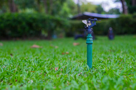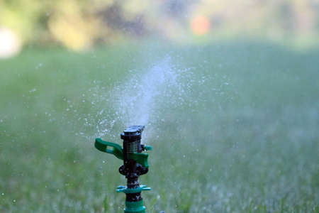 Lawn sprinkler spraying water on fresh green grass with bokeh background