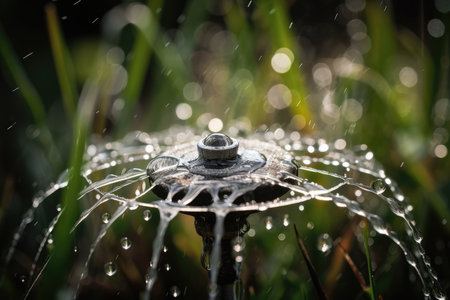 close-up of sprinkler, with droplets of water visible, created with generative ai