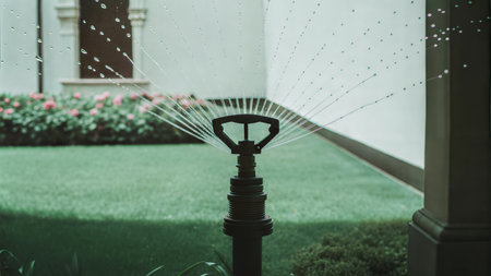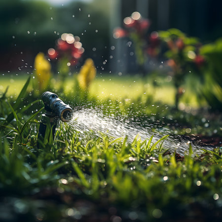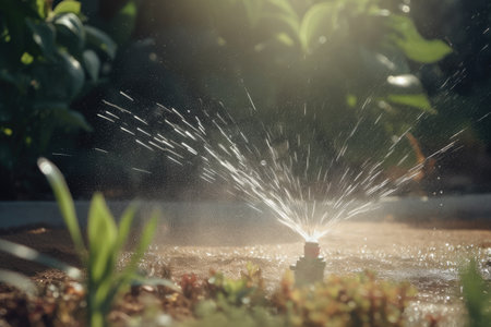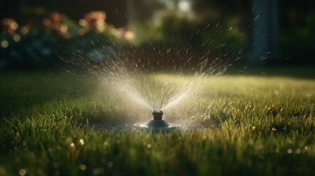 close-up of sprinkler head, spraying water in a backyard garden, created with generative ai